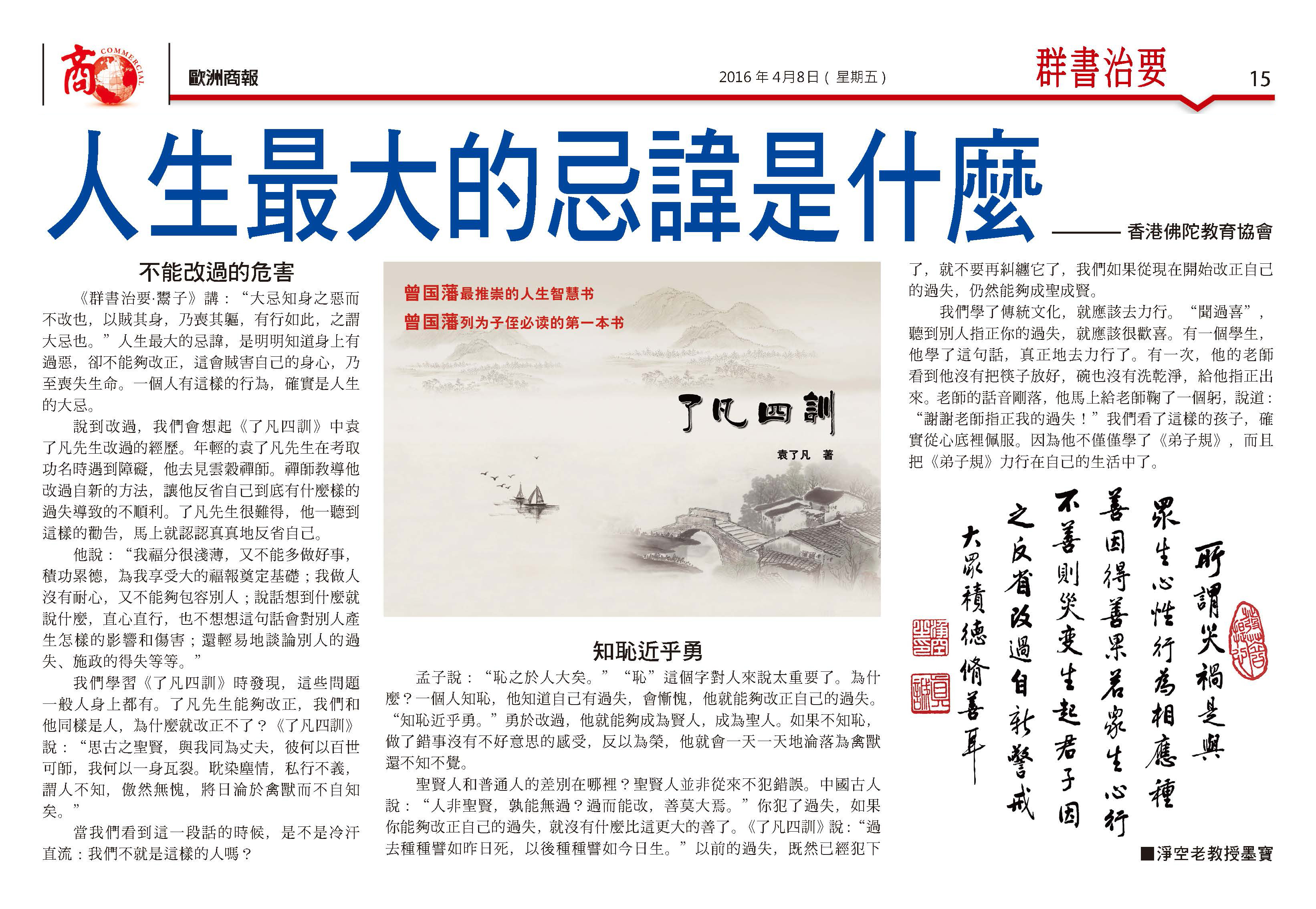 我們學習《了凡四訓》時發現,這些問題一般人身上都有。了凡先生能夠改正,我們和他同樣是人,為什麼就改正不了?《了凡四訓》說:“思古之聖賢,與我同為丈夫,彼何以百世可師,我何以一身瓦裂。耽染塵情,私行不義,謂人不知,傲然無愧,將日淪於禽獸而不自知矣。”
