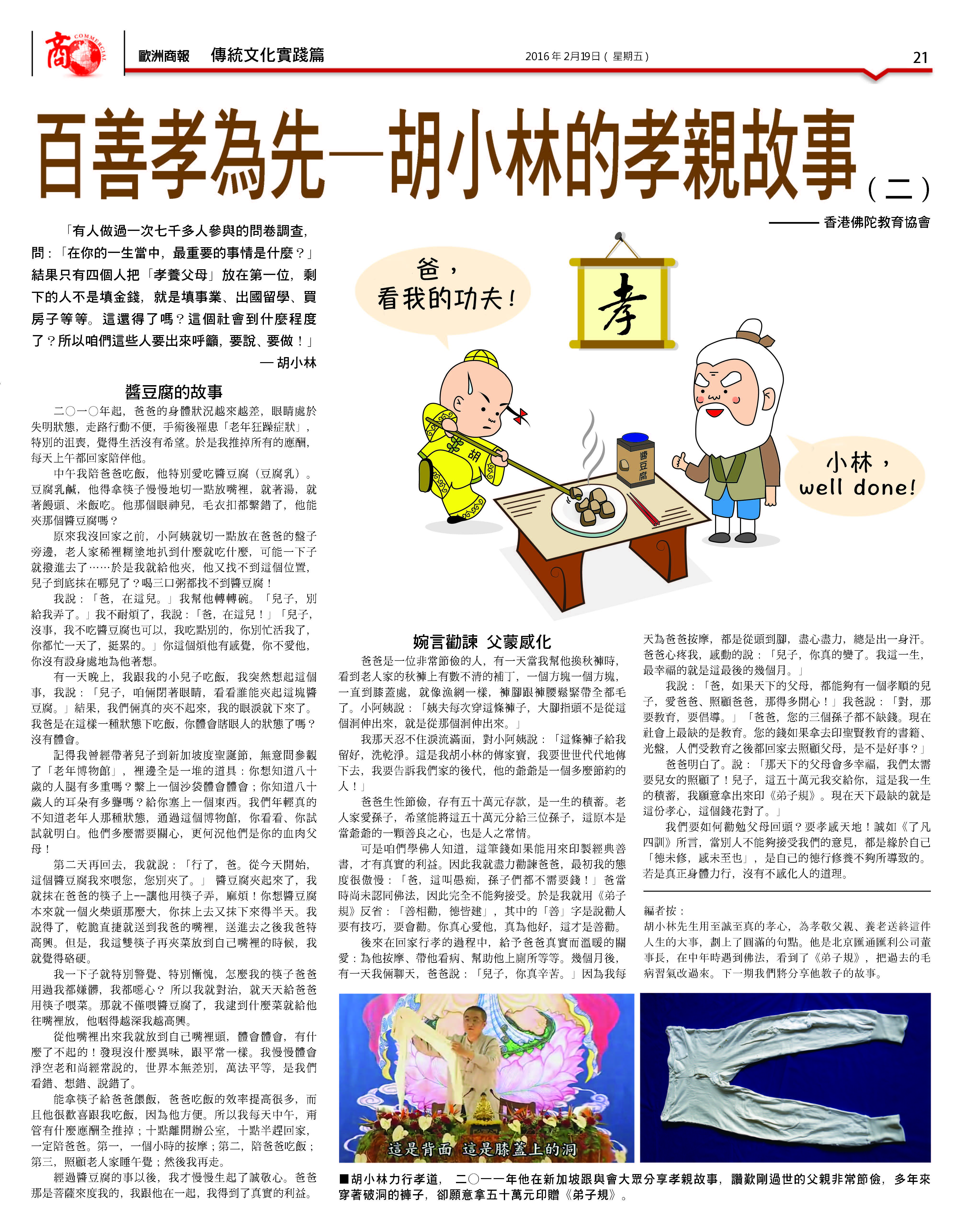 我說:「爸,如果天下的父母,都能夠有一個孝順的兒子,愛爸爸、照顧爸爸,那得多開心!」我爸說:「對,那要教育,要倡導。」「爸爸,您的三個孫子都不缺錢。現在社會上最缺的是教育。您的錢如果拿去印聖賢教育的書籍、光盤,人們受教育之後都回家去照顧父母,是不是好事?」